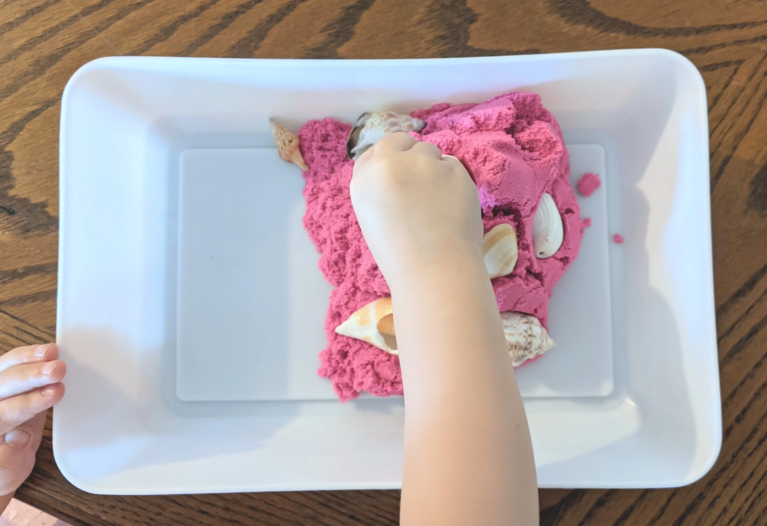 With each day of Creation I set up activities for my learners. You know me - I like to keep it simple! We played with shadows, kinetic sand, and counted fish crackers. This kinetic sand with sea shells activity is always a favorite.