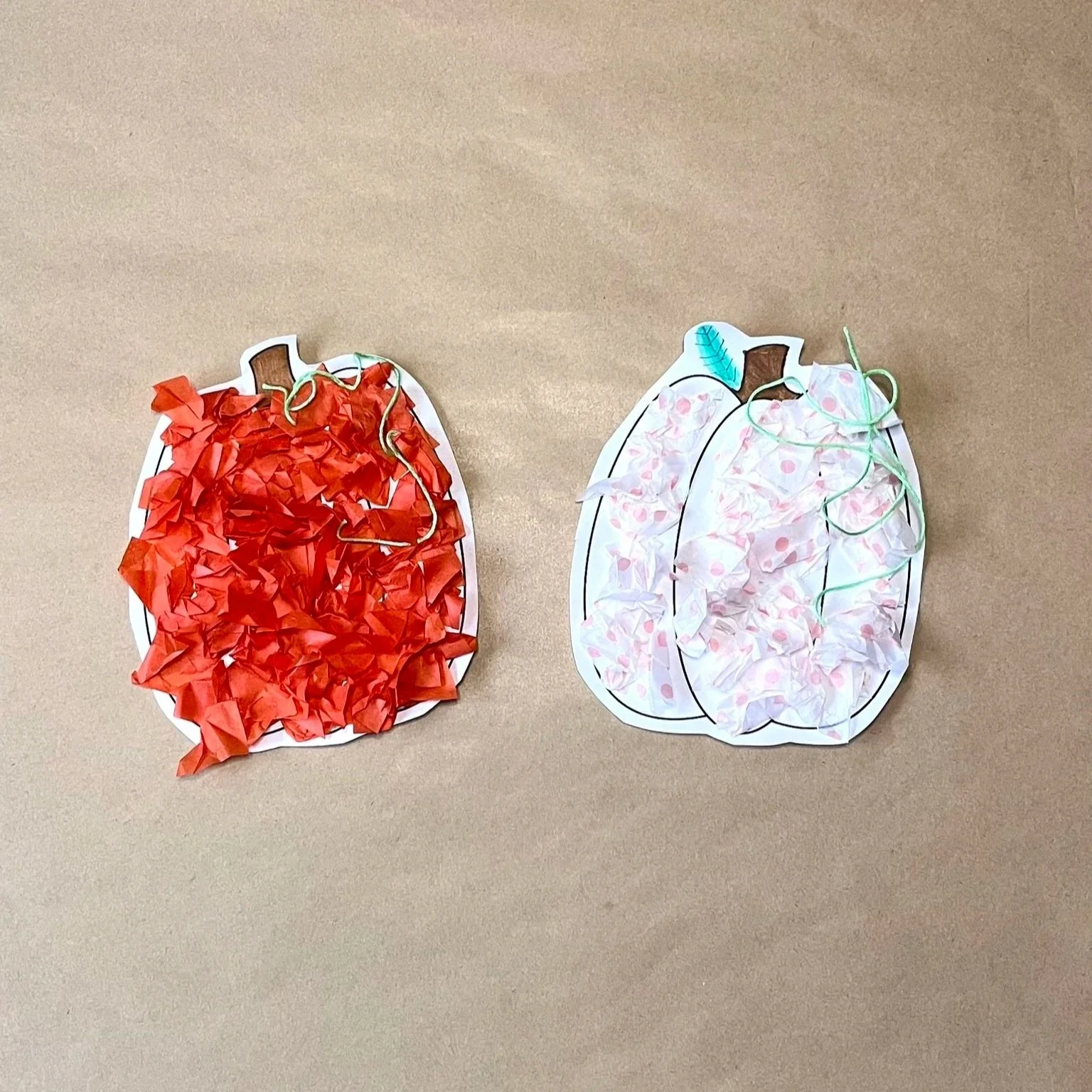 This was a regular activity in my preschool classroom, and the kids loved it! To do this, pick a seasonal template. It can be anything, but this time we made pumpkins. Then cut up little squares of tissue paper. Direct students to scrunch the pieces up and glue them onto the template. This activity is great for developing a pinch grasp - an important pre-writing skill.
