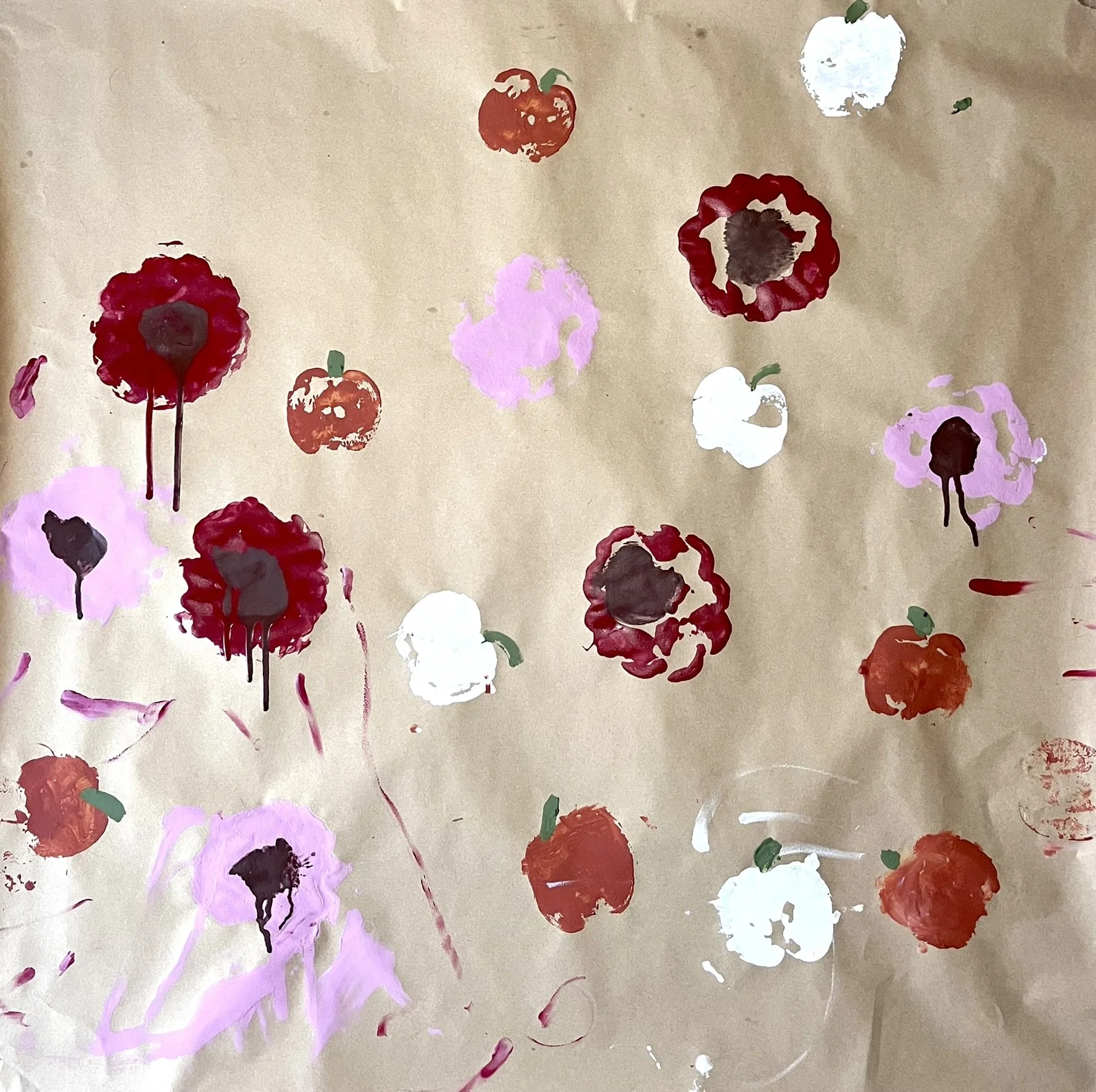 Yes, you can do this one! It's messy, wonderful things happen when we allow kids freedom in creativity. There are so many ways to put this together. The basic formula for process art is: paint + stamp. The stamp can truly be anything. We used acorn squash and apples - any firm fruit or veggie works. If you don't want to use food, you can scrounge through your craft supplies, recycle bin, or toys for inspiration. In the past we've used wrapping bows, Legos, toy cars, and toilet paper rolls. It's fun to let the kids play around and see what they come up with!